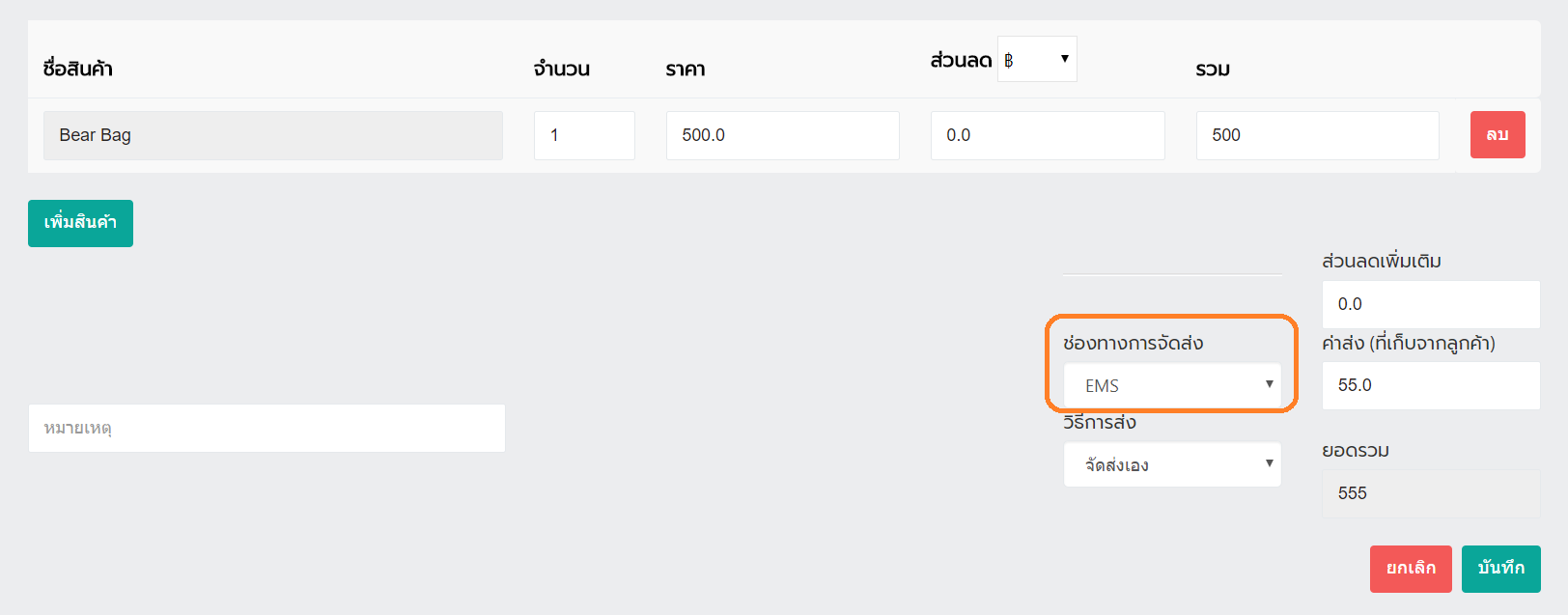 2. ใส่ข้อมูลลูกค้า เพิ่มสินค้า จากนั้นเลือก ช่องทางการจัดส่ง