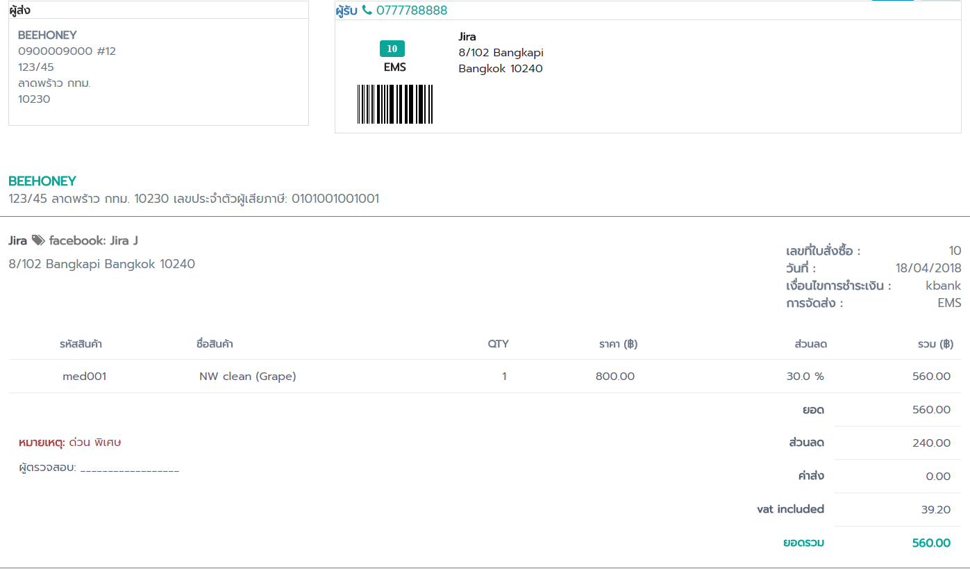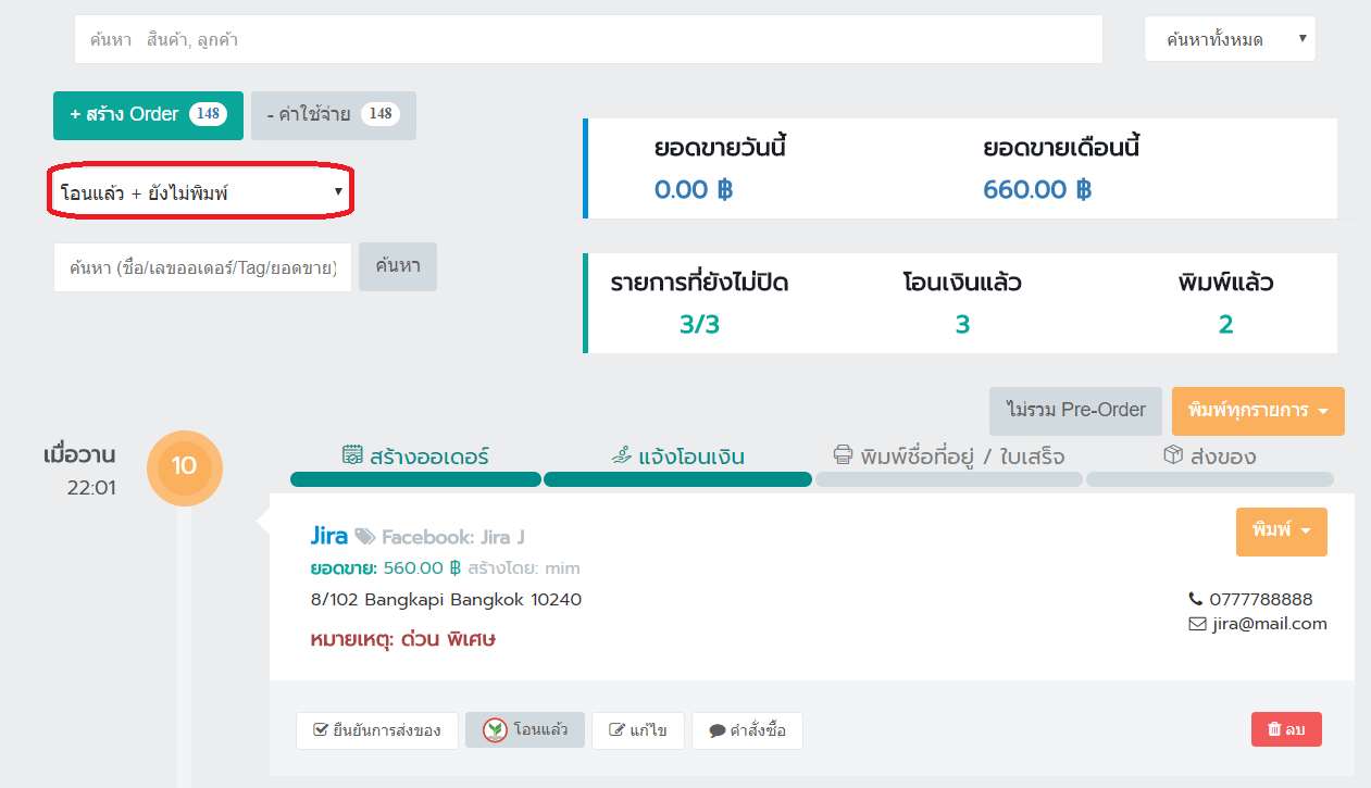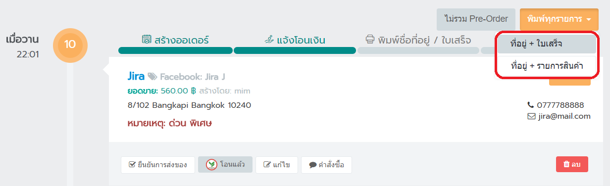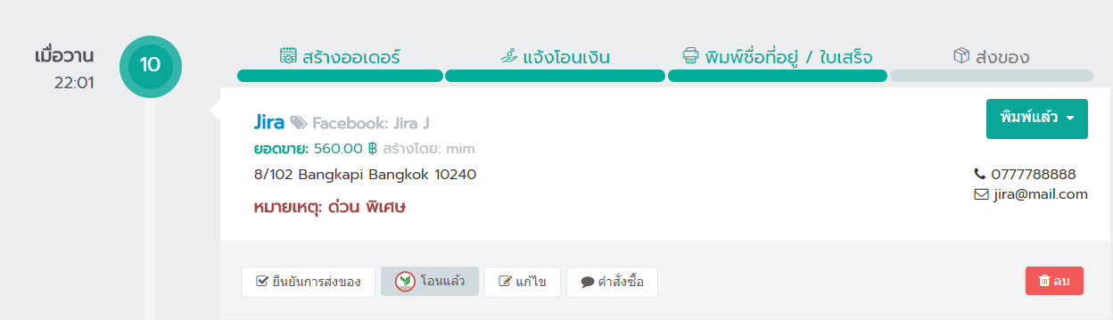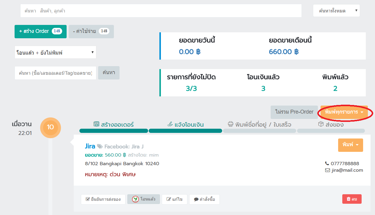 4. จากนั้นสถานะออเดอร์จะเป็นพิมพ์แล้ว