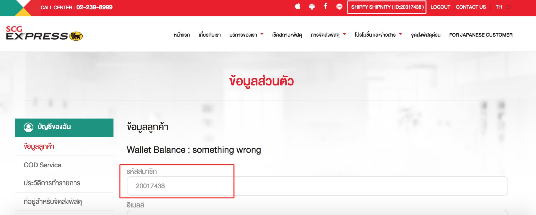 6. ในช่อง “รหัสสมาชิก SCG Express” ให้กรอกรหัสสมาชิกที่ได้สมัครไว้