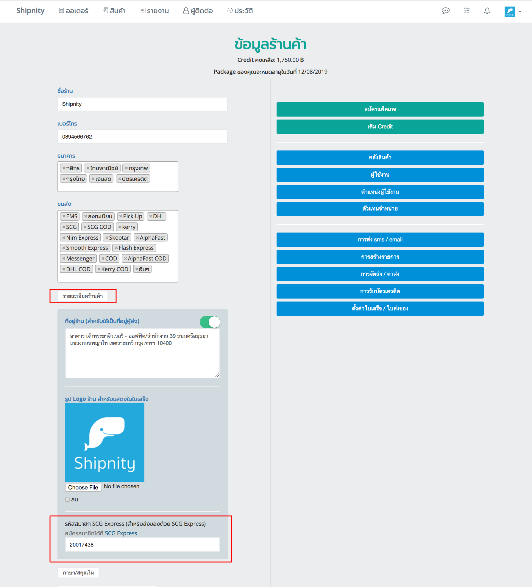 6. กดที่เมนู “รายละเอียดร้านค้า” จากนั้นกรอกที่อยู่ร้านที่ต้องการใช้เป็นที่อยู่ผู้ส่ง, รูป Logo (มีหรือไม่มีก็ได้) และรหัสสมาชิก