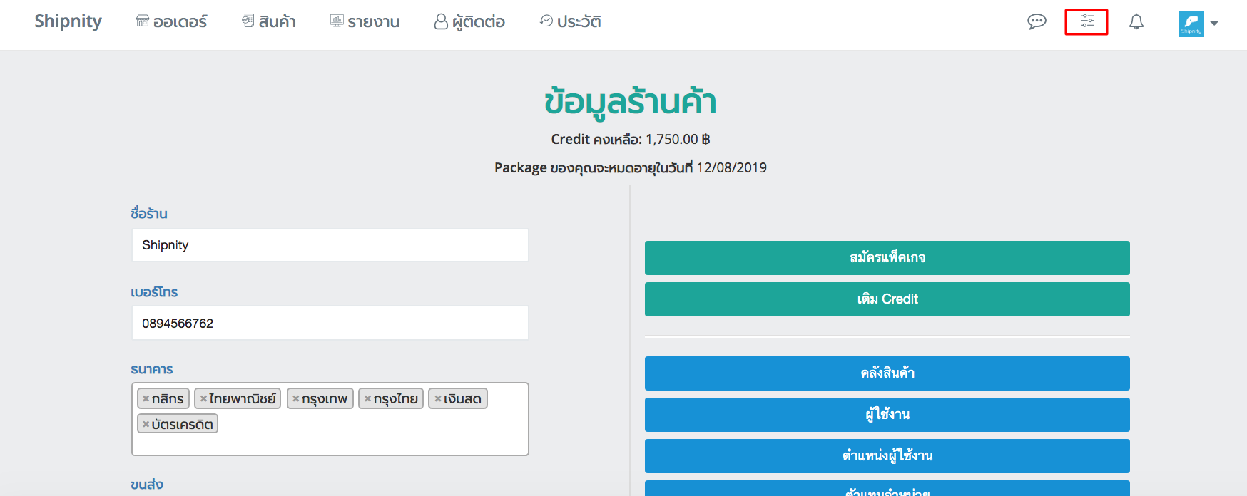4. ดูเครดิตคงเหลือจากข้อมูลร้านค้า ได้ที่หน้า ตั้งค่า
